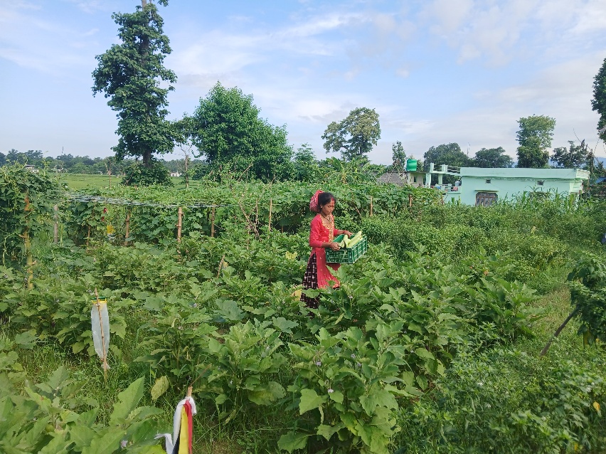 Later, Janaki became a member of the Chaudhary Pragati Mahila Farmer Field School Group. Over time, she not only emerged as an active member but was also elected as the Chairperson of the group. She participated in a two-day FFS Leader Farmer Training, where she gained knowledge on organic fertilizers, organic pesticides, improved seeds, and modern farming practices. Inspired by the training, she gradually abandoned traditional farming methods and adopted climate-smart and organic agricultural practices, completely avoiding harmful chemical pesticides. Janaki now regularly participates in training programs organized by the ward-level knowledge center and demonstrates strong leadership within her group. Through her involvement in the Skill Up Project, she has become aware of the importance of nutrition and has started including nutritious food in her daily diet. She also ensures that her children receive a balanced and nutritious diet, contributing to their healthy growth. She practices seasonal vegetable farming based on market demand and is now capable of identifying and selecting improved seeds. In the current year, she cultivated cucurbit vegetables and earned approximately NPR 60,000 from their sale. With this income, she purchased a weighing scale, vegetable crates, and seeds, further strengthening her farming activities.
